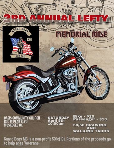The Three Rivers Chapter of the Guard Dogs MC was chartered on September 13, 2011. Three Rivers Chapter is in Muskogee, OK and chose the name for the three rivers that merge just north of town, the Arkansas, Verdigris, and Neosho. Although GDMC started as an organization for National Guard members, we now accept Veterans and current members from all branches of the U.S. Armed Forces. We are a family of like-minded individual who enjoy riding motorcycles and our service to our country.